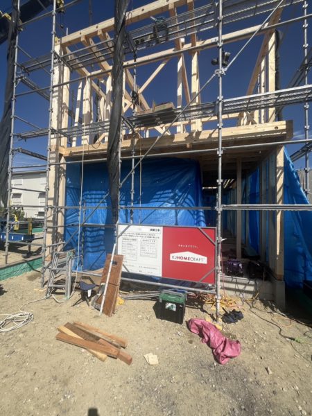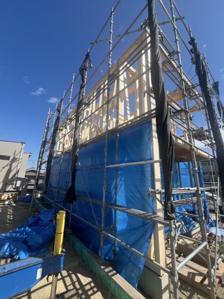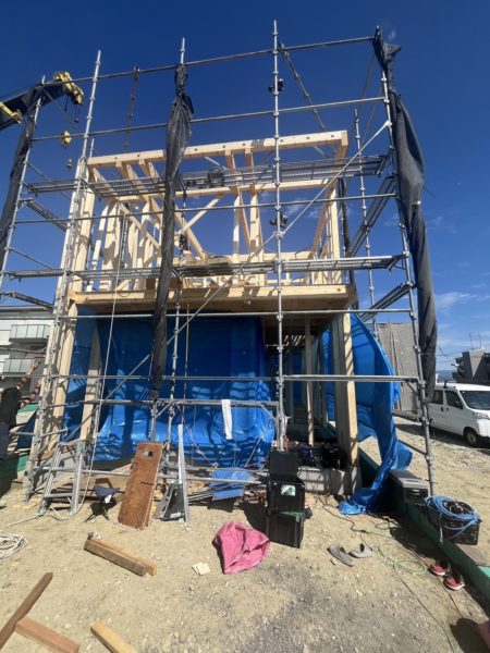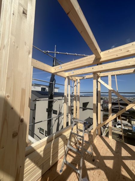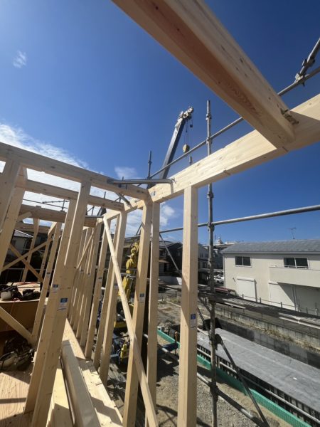 秋晴れでとてもいい天気での上棟は気持ちがいいですね